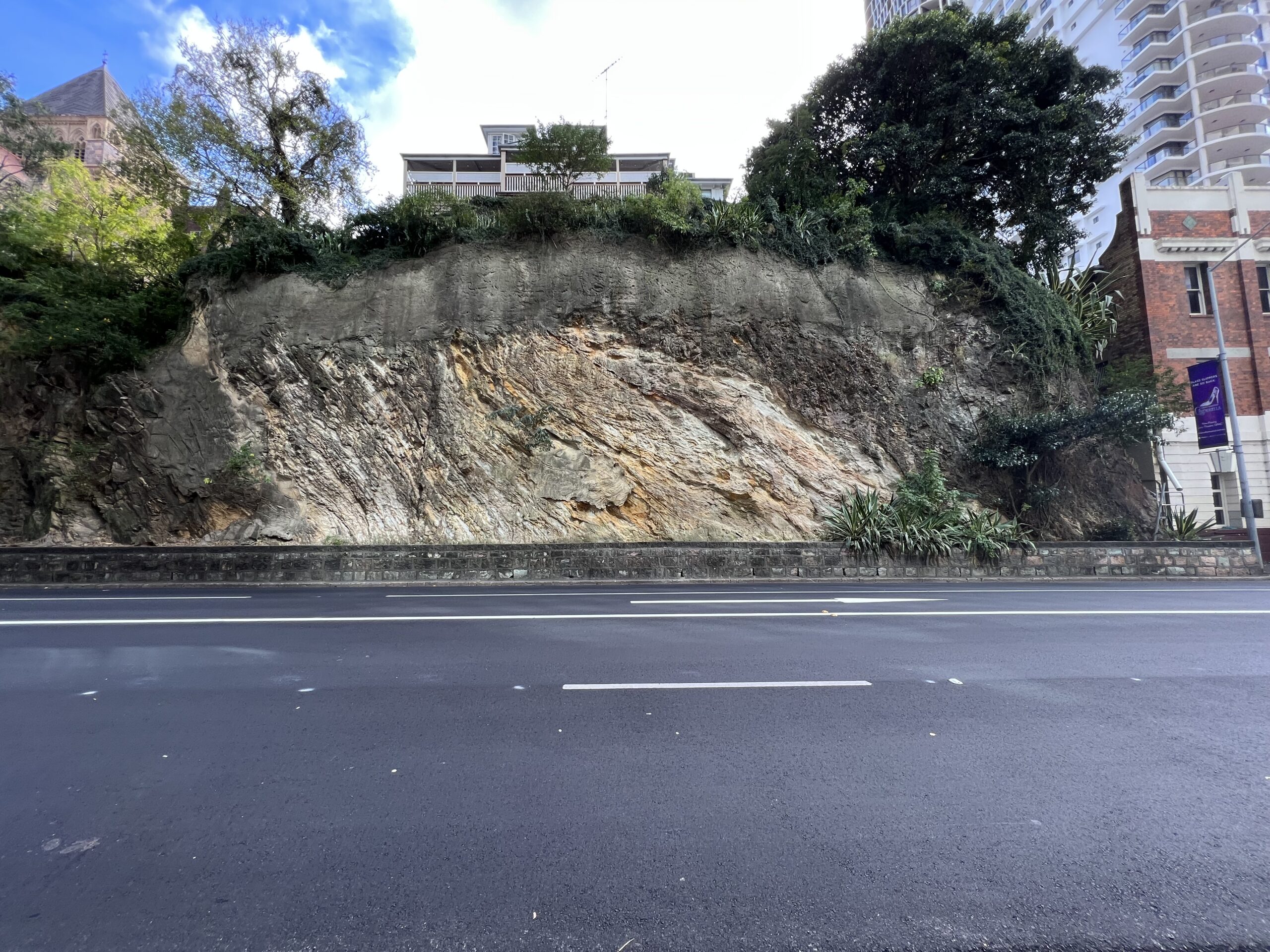The site posed multiple challenges, including being a busy road corridor within Brisbane City, with the slope displaying multiple signs of previous slope stabilisation works including shotcrete and stone masonry works.